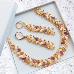 Náramek (18cm) + Náušnice, Japonské korálky Miyuki, chirurgická ocel - zlaá galvanizace, No. 612