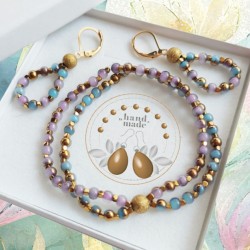 Dvojitý náramek (obvod 17,4 cm) + Náušnice, Akvamarín, Ametyst, chirurg. ocel - zlatá galvanizace, No.628